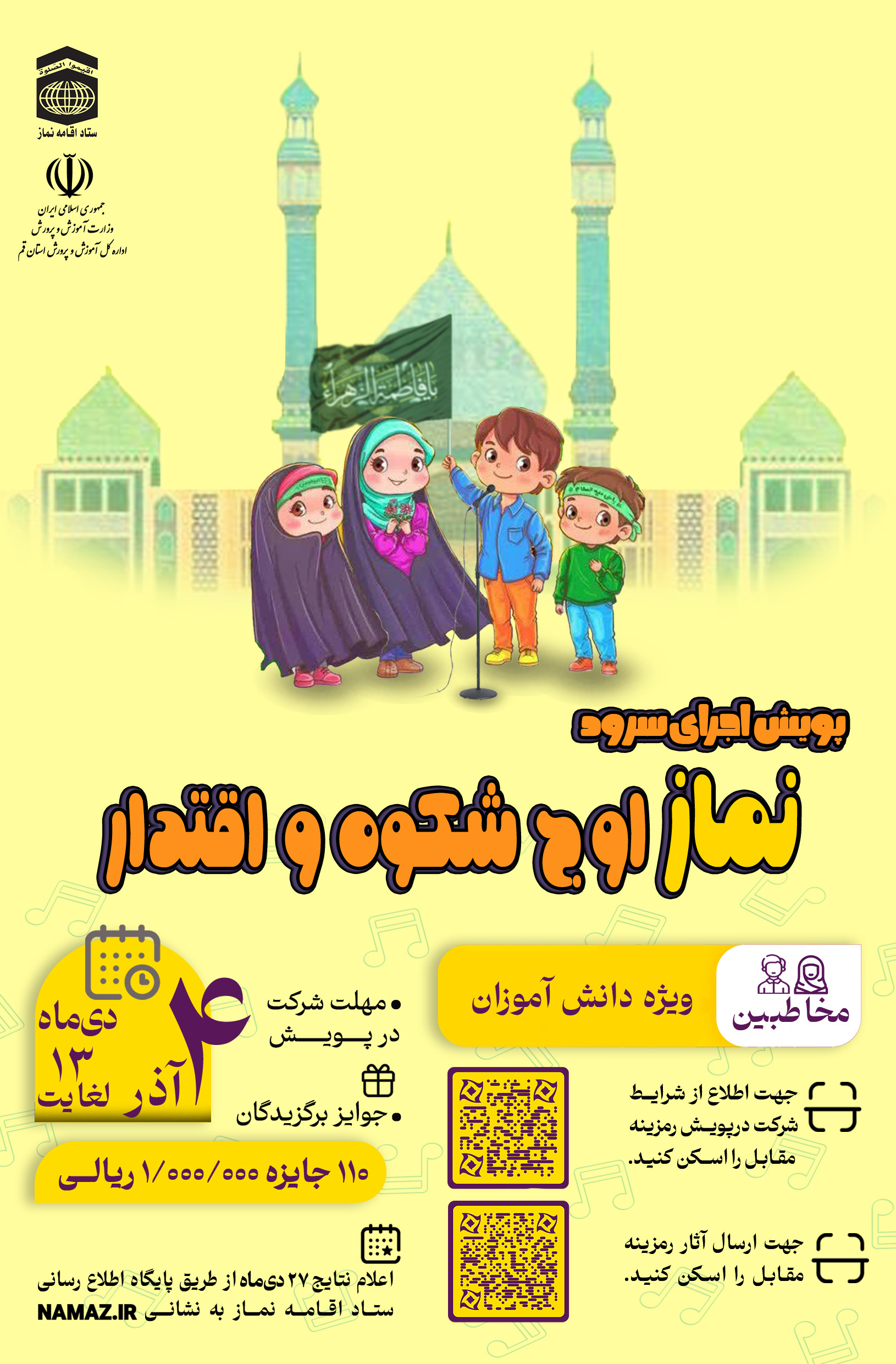 ستاد اقامه نماز استان قم با هدف ترویج فرهنگ نماز در مدارس و تشویق دانشآموزان به مشارکت فعال و خلاقیت، پویش استانی اجرای سرود نماز “نماز اوج شکوه و اقتدار” را ویژه دانشآموزان استان قم و با همکاری اداره کل آموزش و پرورش برگزار میکند.