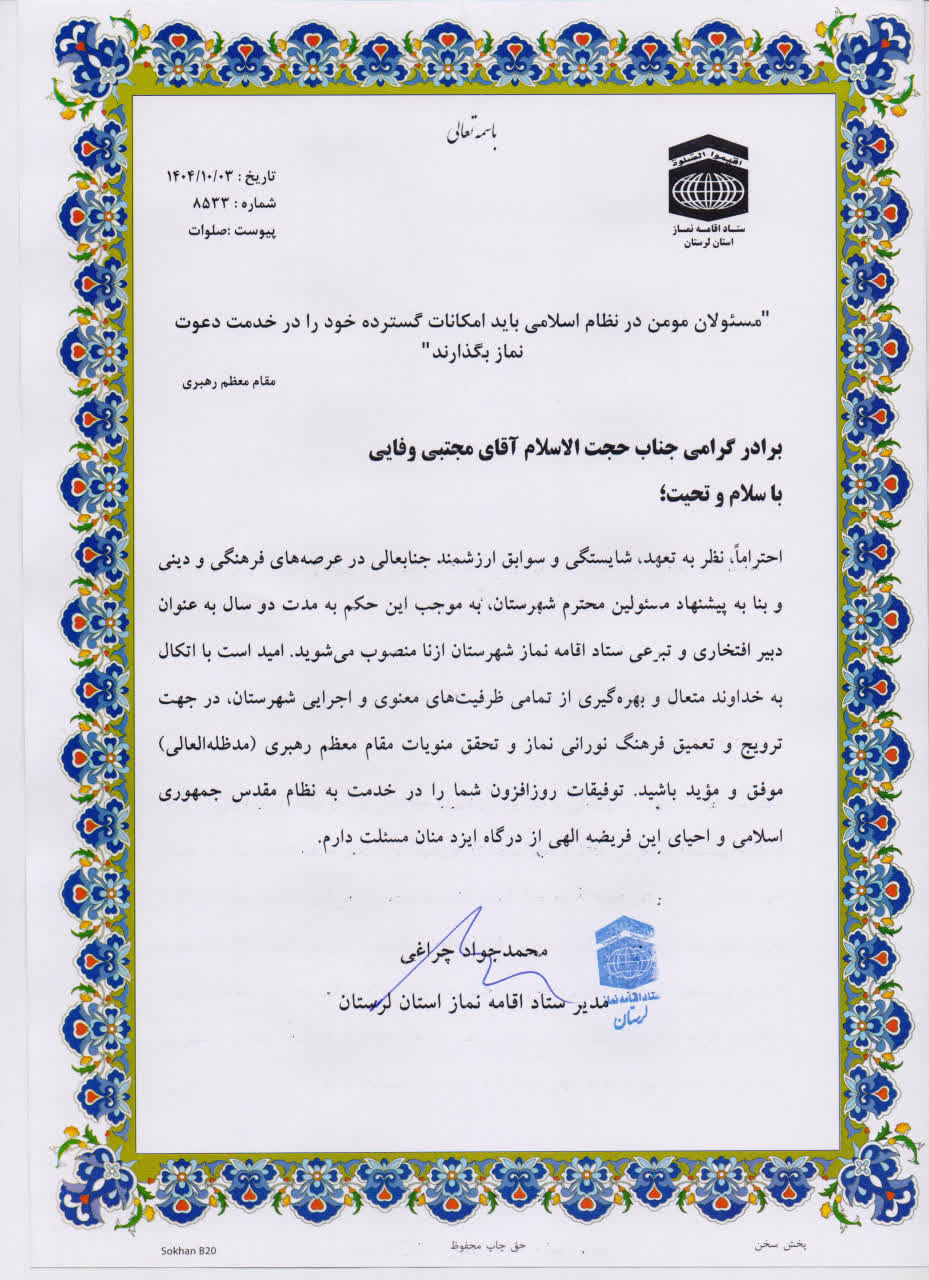 مدیر ستاد اقامه نماز استان اعلام کرد که این انتخاب به دلیل فعالیتهای چشمگیر، پیگیریهای مستمر و پشتیبانی همهجانبه امام جمعه شهرستان از برنامههای ترویج فرهنگ نماز در شهرستان ازنا صورت گرفته است.