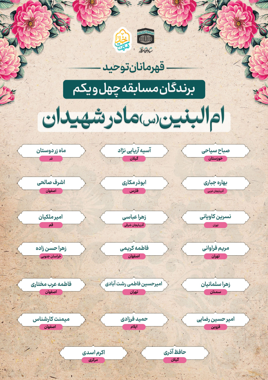 جهت مشاهده برگزیدگان مسابقه قهرمانان توحید قسمت چهل و یکم اینجا کلیک فرمایید.