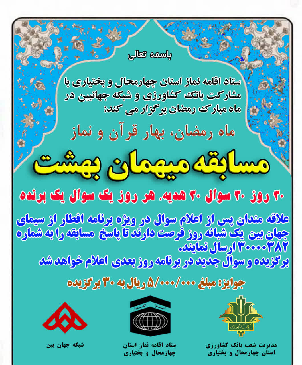 به گزارش روابط عمومی ستاد اقامه نماز استان چهارمحال و بختیاری، حجتالاسلام و المسلمین محمد کریمی مدیر ستاد اقامه نماز استان، روز شنبه، دورم اسفندماه، در گفتگو با روابط عمومی ستاد استان از برگزاری مسابقه میهمان بهشت با عنوان سی سوال سی هدیه در ایام ماه مبارک رمضان خبر داد.