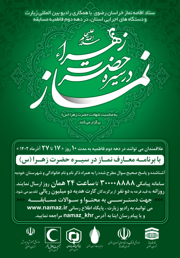 به گزارش روابط عمومی ستاد اقامه نماز خراسان رضوی، ستاد اقامه نماز با همکاری رادیوی بین المللی زیارت و دستگاههای اجرایی استان، مسابقه “نماز در سیره حضرت زهرا(س)” در دهه دوم فاطمیه برگزار می کند.