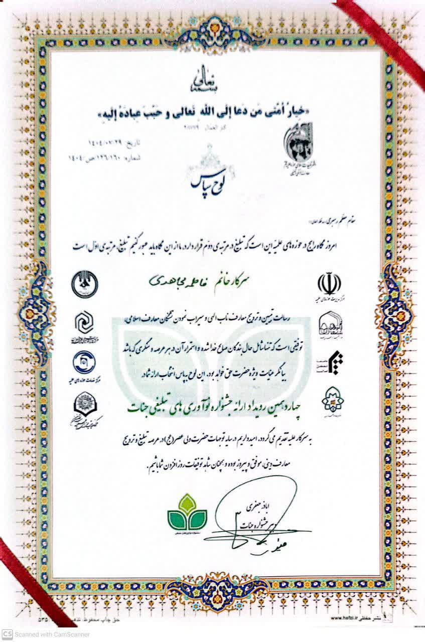 به گزارش روابط عمومی ستاد اقامه نماز قم، در آیین اختتامیه چهاردهمین جشنواره نوآوری های تبلیغی جنات، طرح ابتکاری «نقش نماز در صیانت از خانواده» به عنوان یکی از طرح های برتر این دوره از جشنواره معرفی و از فاطمه مجاهدی مشاور امور بانوان و خانواده ستاد اقامه نماز استان به عنوان طراح این اثر تقدیر به عمل آمد.