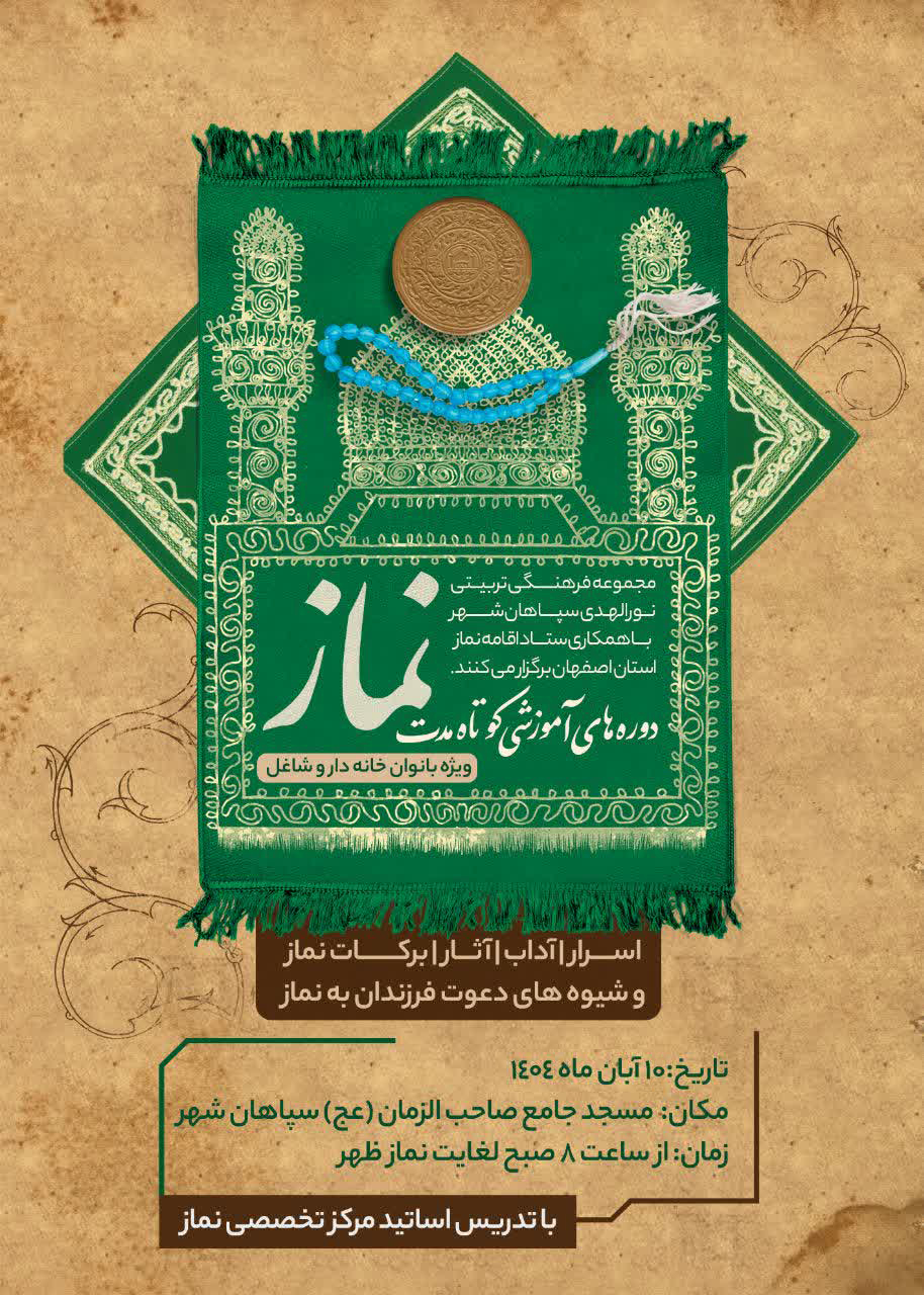 به گزارش روابط عمومی ستاد قامه نماز استان اصفهان، مجموعه فرهنگی تربیتی نورالهدی سپاهان شهر با همکاری ستاد اقامه نماز استان اصفهان اقدام به برگزاری دوره های آموزشی کوتاه مدت نماز ویژه بانوان خانه دار و شاغل در روز شنبه دهم آبان ماه در مسجد جامع صاحب الزمان(عج) سپاهان شهر نموده است.