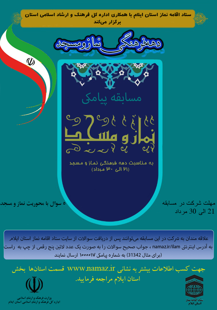 به گزارش روابط عمومی ستاد اقامه نماز استان ایلام، به مناسبت دهه فرهنگی نماز و مسجد، مسابقه پیامکی نماز و مسجد با مشارکت اداره کل فرهنگ و ارشاد اسلامی استان ایلام برگزار می‌شود.