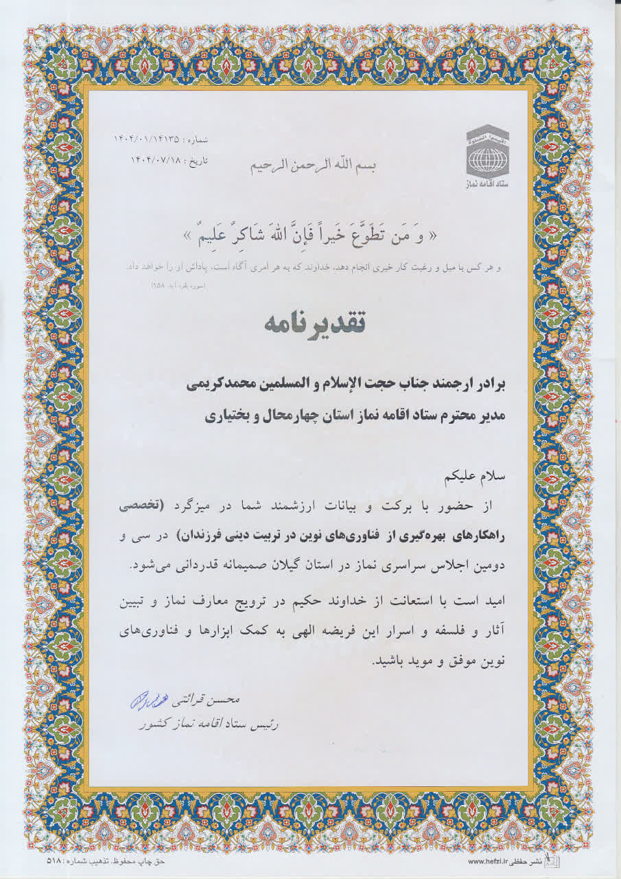 از حضور با برکت و بیانات ارزشمند شما در میزگرد (تخصصی راهکارهای بهرهگیری از فناوریهای نوین در تربیت دینی فرزندان) در سی و دومین اجلاس سراسری نماز در استان گیلان صمیمانه قدردانی میشود.