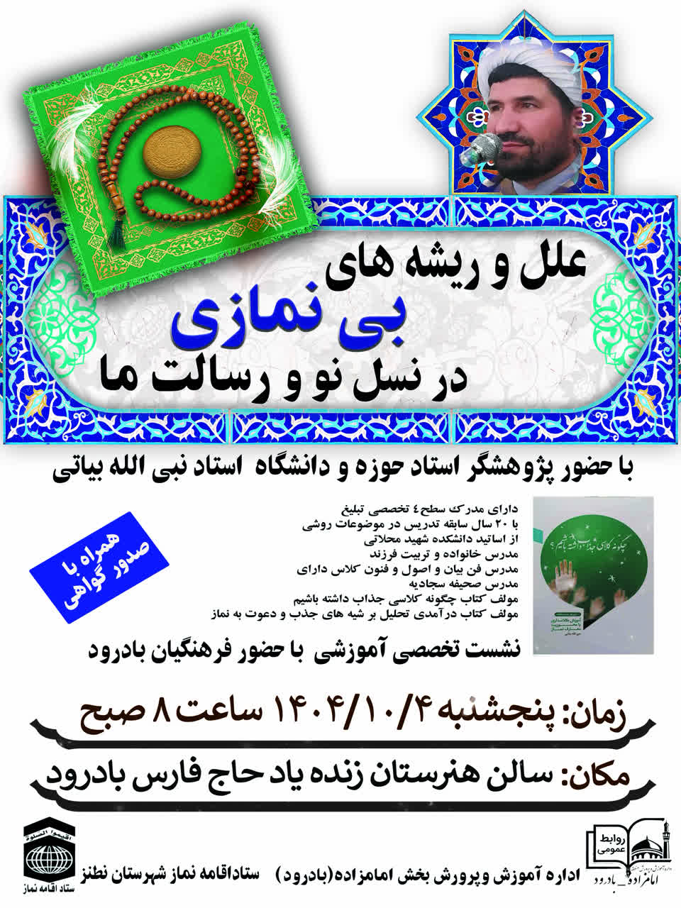 به گزارش روابط عمومی ستاد اقامه نمازاستان اصفهان، در راستای ارتقای سطح آگاهی و توانمندسازی فرهنگیان در حوزه تربیت دینی و اجتماعی، جلسه ضمن خدمت فرهنگیان با محوریت بررسی علل بی توجهی بخشی از نسل جدید به فریضه نماز روز پنجشنبه چهارم دی ماه در سالن هنرستان زنده یاد حاج فارس ترابیان بادرود شهرستان نطنز با سخنرانی حجت الاسلام والمسلمین نبی الله بیاتی استاد مرکز تخصصی نماز قم برگزار شد.